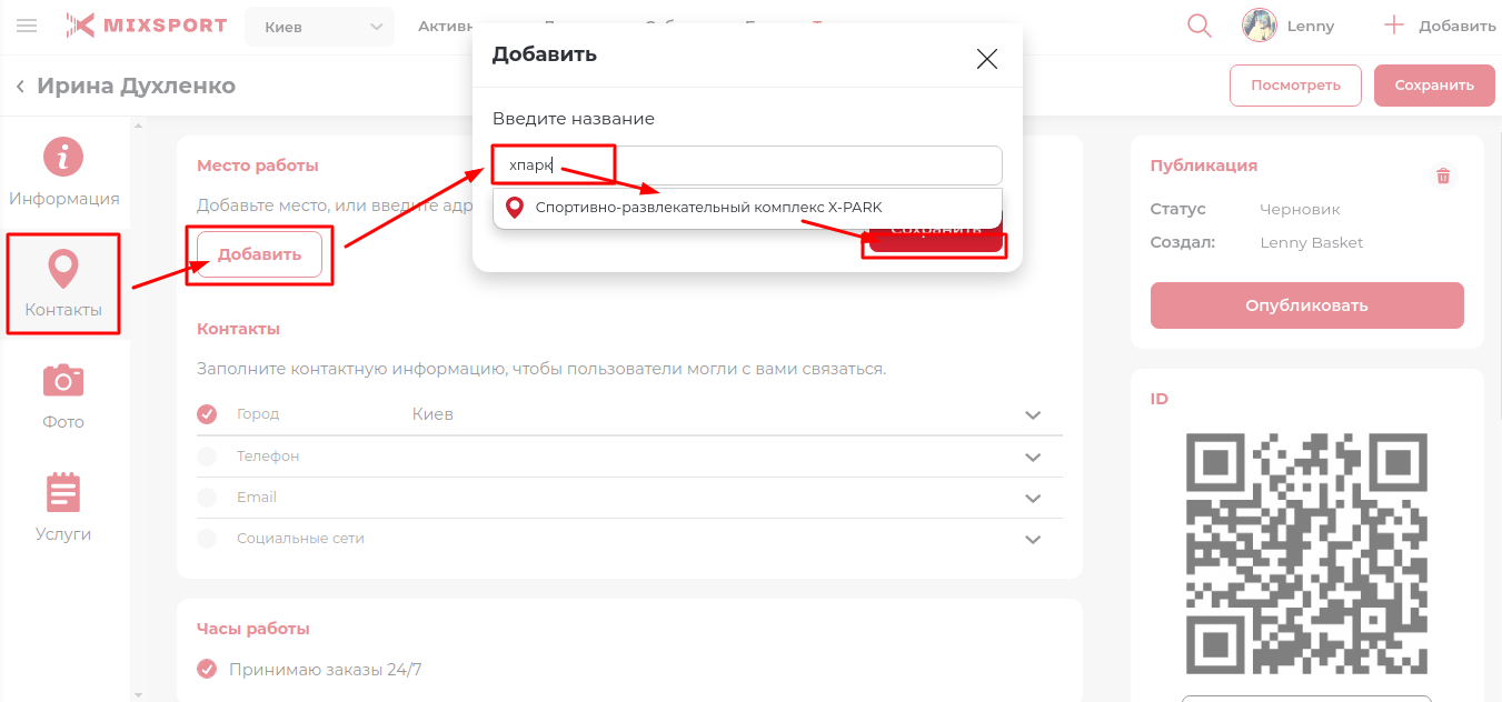Во вкладке «Контакты», нажмите на кнопку «Добавить» и введите название локации, где вы работаете. (Если локация есть на сайте, выберите её из списка, если локации нет в списке, её можно добавить.)
