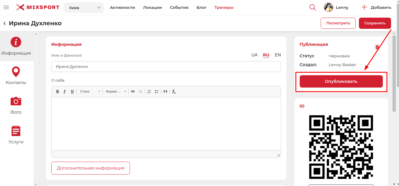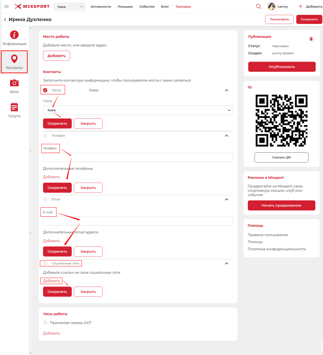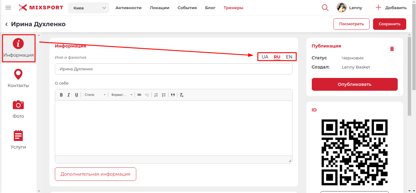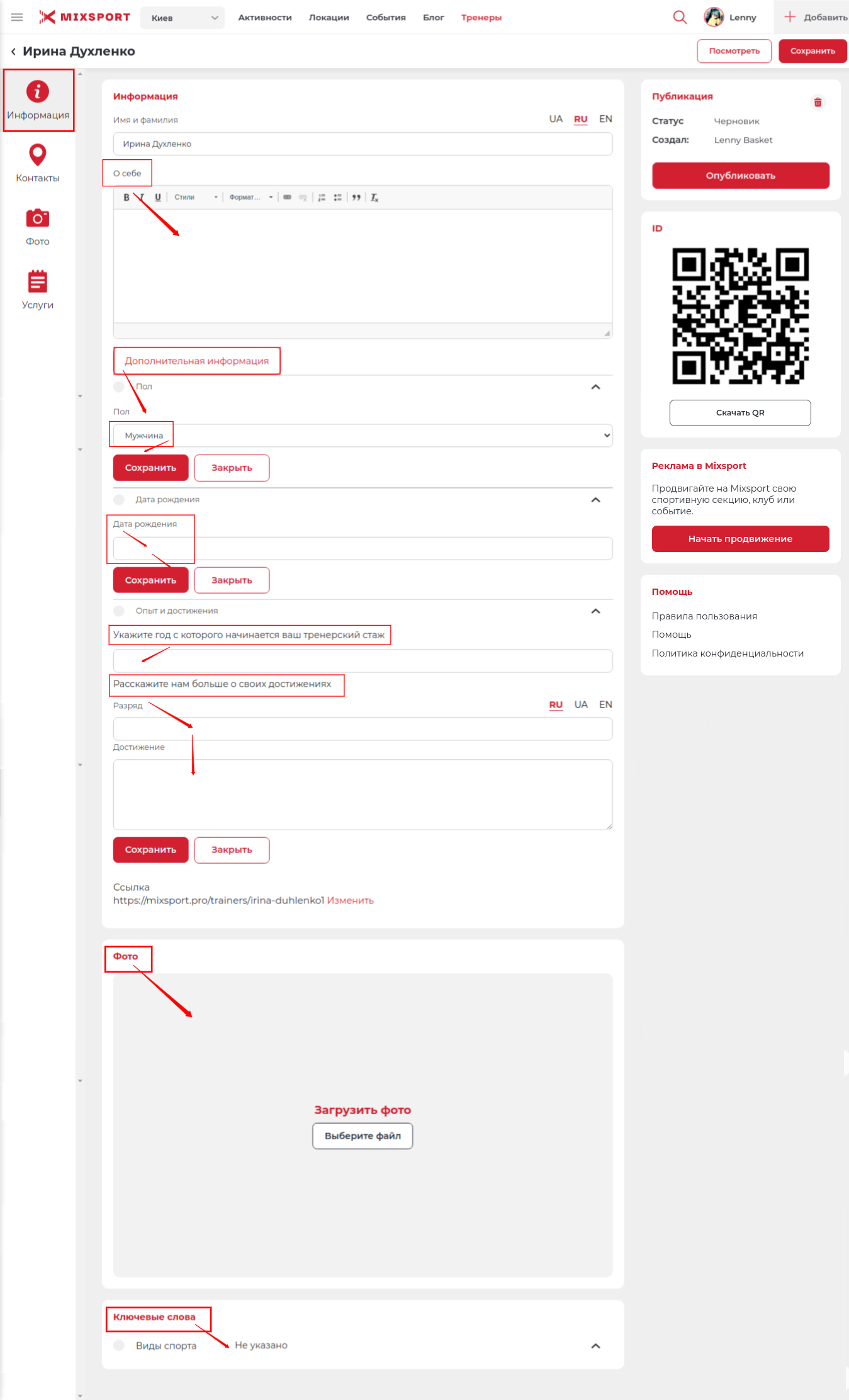 При создании тренера на портале, важно правильно заполнить все поля в этом разделе. Чем больше информации вы предоставите, тем быстрее пользователь сможет с вами связаться, и заказать вашу услугу.