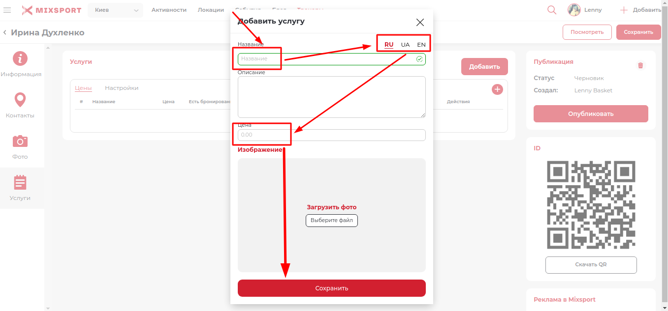 и в окне «Добавить услугу», введите название услуги (на трёх языках), укажите цену и нажмите на кнопку «Сохранить»