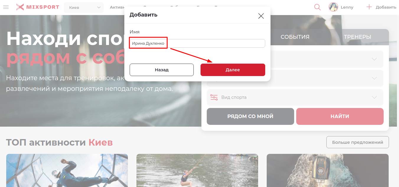 Введите имя тренера, и нажмите на кнопку «Далее»